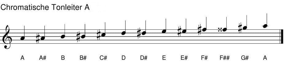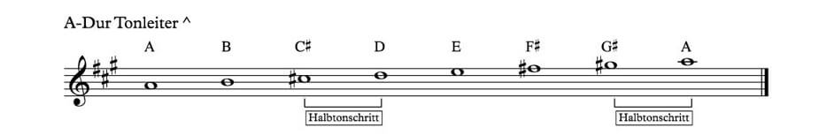 Dafür wird die A-Dur Tonleiter mit den Halbtonschritten ergänzt, so das der Abstand innerhalb der Tonleiter ein Halbtonschritt beträgt. Mit der diatonischen Tonleiter (hier A-Dur Tonleiter) mit ihren 7 Stammtönen (A, B, C♯, D, E, F♯, G♯, A) wäre der Tonschritt hier von A nach B.