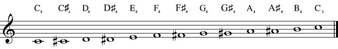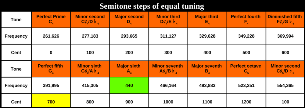 Hier die chromatischen Tonschritte die hier als C4 starten mit der passenden Frequenzangabe, hier mit 261,626 Hertz. Die hier mit 440 Hertz dargestellte Frequenz ist auch die nach ISO Norm im Jahr 1939 festgelegte Frequenz für den Stimmton A4 (Kammerton). Die Maßangabe in Cent stellt die Oktave mit der Stimmung des Tones dar, wobei eine ganze Oktave 1200 Cent hat. Startet die Oktave als C4, hat die Quinte G4 hier dann 700 Cent, da jeder Tonschritt mit 100 Cent dargestellt wird.