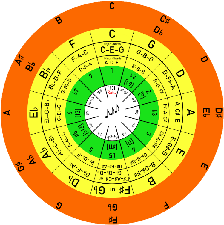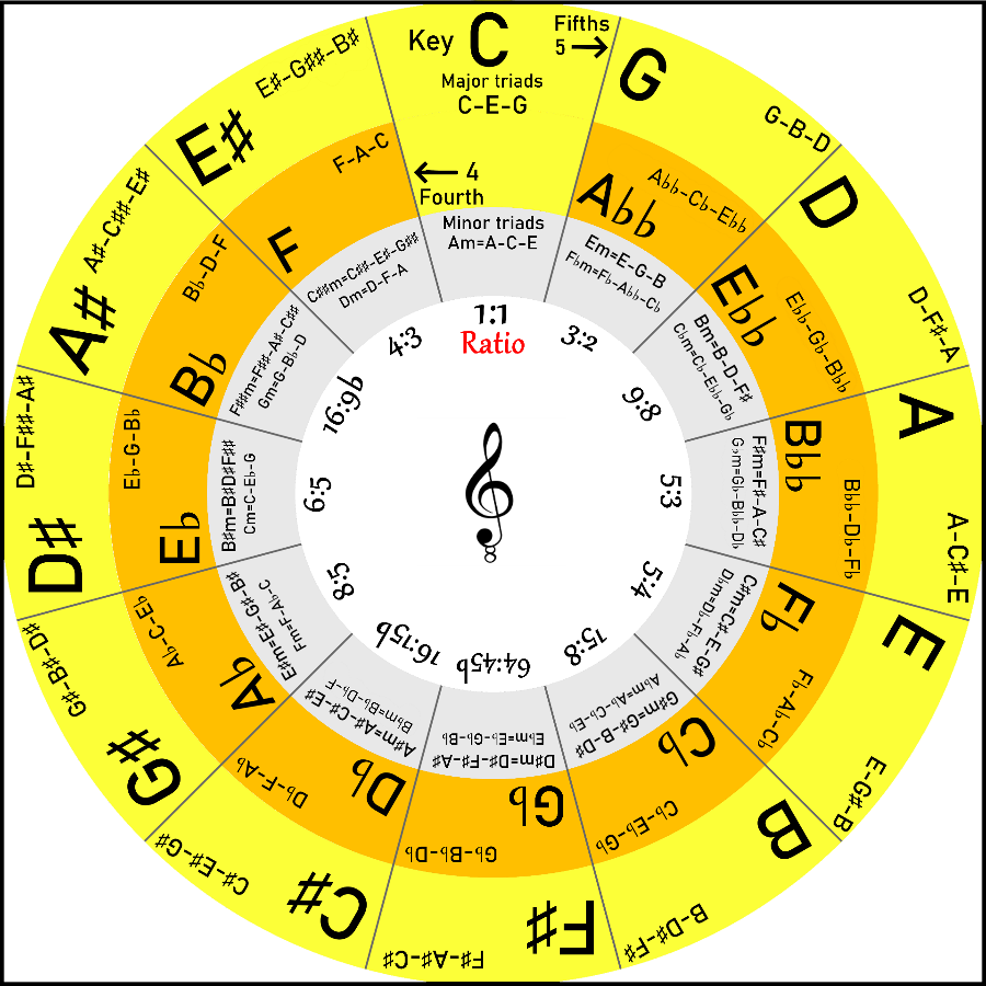 Die 12 Tonarten, die im Quintenzirkel dargestellt werden, sind in Quintenschritten angeordnet. Mit dem Quintenschritt von C nach G ändert sich auch ein Vorzeichen einer Tonart in der Tonleiter. Da der Platz der Halbtonschritte in der Art der diatonischen C-Dur Tonleiter erhalten bleiben sollen, erhält die G-Dur Tonleiter, mit einem Halbtonschritt weiter, ein F♯. Mit jedem weiteren Quintenschritt wechselt auch eine Tonart ihr Vorzeichen in der Tonleiter. Die Vorzeichen sind dann dabei, in den Tonleitern von G startend mit dem Ton F♯, D mit C♯, A mit G♯, E mit D♯, B mit A♯, F♯ mit E♯, C♯ mit B♯ die in dieser Richtung auch aufsteigend nacheinander erhalten bleiben. Gegen den Uhrzeigersinn ändert sich auch eine Tonart mit einem Halbtonschritt in der Tonleiter. Die F-Tonleiter erhält damit ein B, das in der Tonleiter mit einem ♭ (B♭) dargestellt wird, also ein Halbtonschritt davor. Mit jedem weiteren Schritt in dieser Richtung ändert sich auch eine Tonart in der Tonleiter. Die Vorzeichen sind dann dabei, in den Tonleitern mit F startend mit dem Ton B♭, B♭ mit E♭, E♭ mit A♭, A♭ mit D♭, D♭ mit G♭, G♭ mit C♭, C♭ mit F♭ die auch in dieser Richtung in den Tonleitern erhalten bleiben. Hier mit diesem Quintenzirkel dargestellt bis F♯ bzw. G♭.;-D ^^^