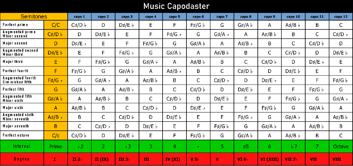Die im Orange dargestellten 12 Tonwerte, hier mit A erhöht erklingt A♯, ist ein chromatischer Halbtonschritt der sich in dieser Richtung durch einen übermäßigen Stammton (A♯) fortbewegt. Die chromatische A-Tonleiter wäre dann aufwärts (A, A♯, B, B♯, C♯, D, D♯, E, E♯,F♯, F♯♯, G♯, A) mit Kreuze (♯) und Doppelkreuze (x) als Halbtonschritte sowie abwärts mit ihren ♭ und Doppel ♭♭.